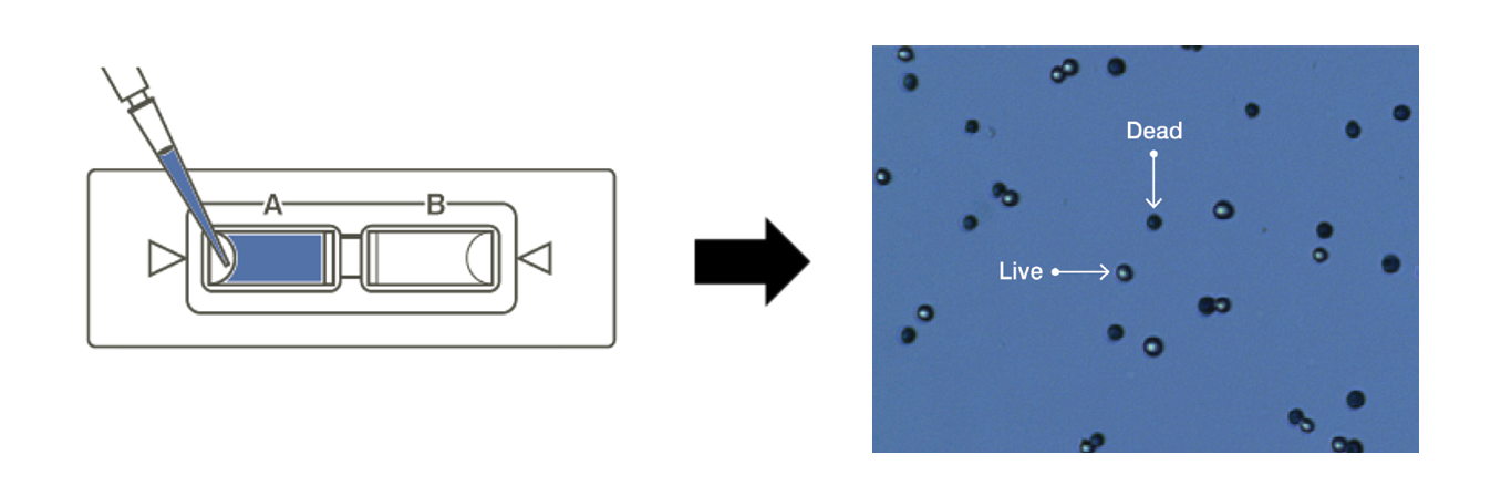 세포를 Trypan blue 시약으로 염색 후 슬라이드에 주입합니다.
