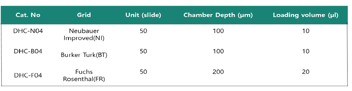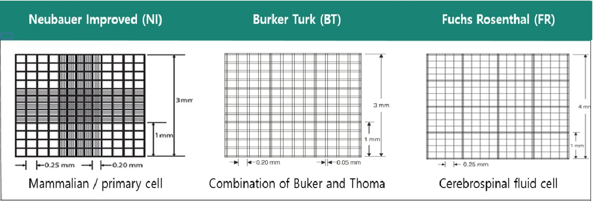 5가지의 grid pattern이 존재합니다. Neubauer Improved(mammalian/primary cell), Burker, Burker Turk(combination of Burker and Thoma), Fuchs Rosenthal(Cerebrospinal fluid cell) and Malassez(Cerebrospinal fluid cell)