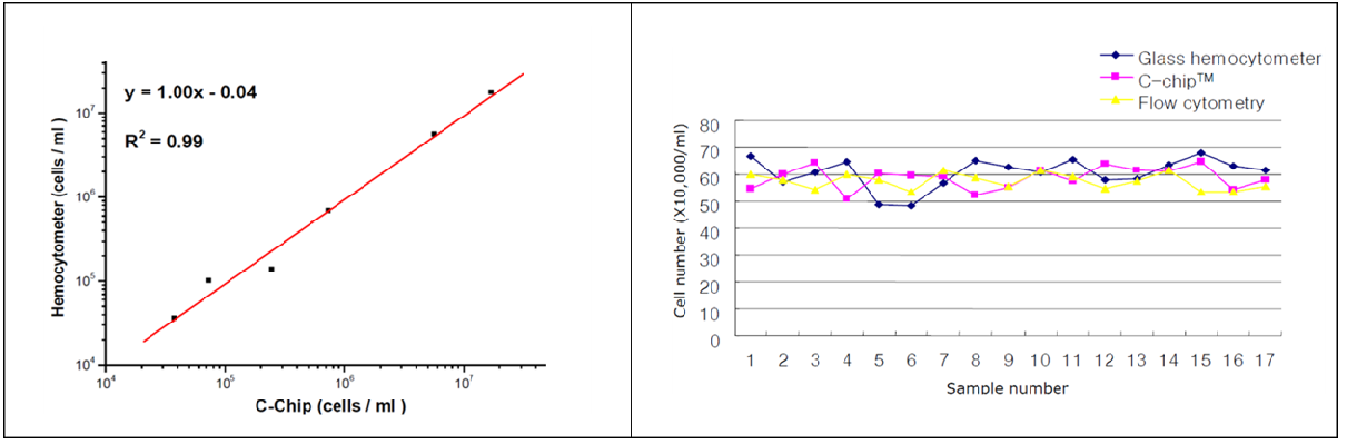 왼쪽 그래프는 glass hemocytometer와 C-chip 사이의 셀 카운팅의 훌룡한 상관관계를 보여줍니다. 오른 쪽 그래프는 C-chip이 glass hemocytometer보다 표준 편차가 작아서 세포 수치의 오차가 적다는 것을 보여줍니다.