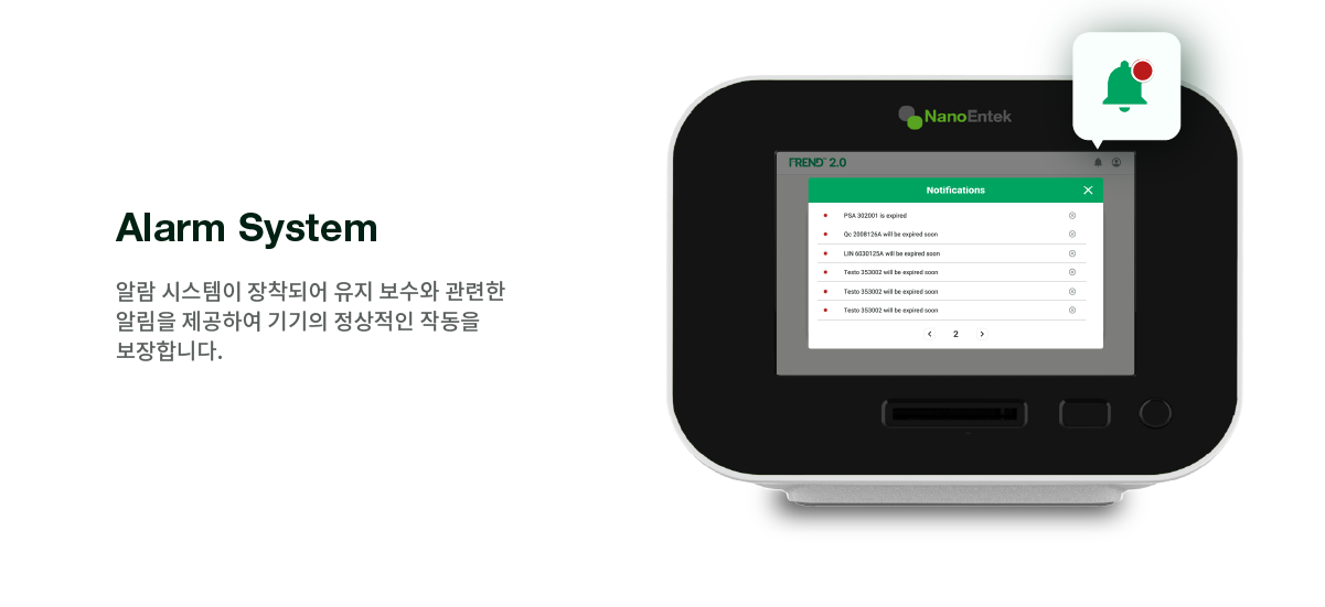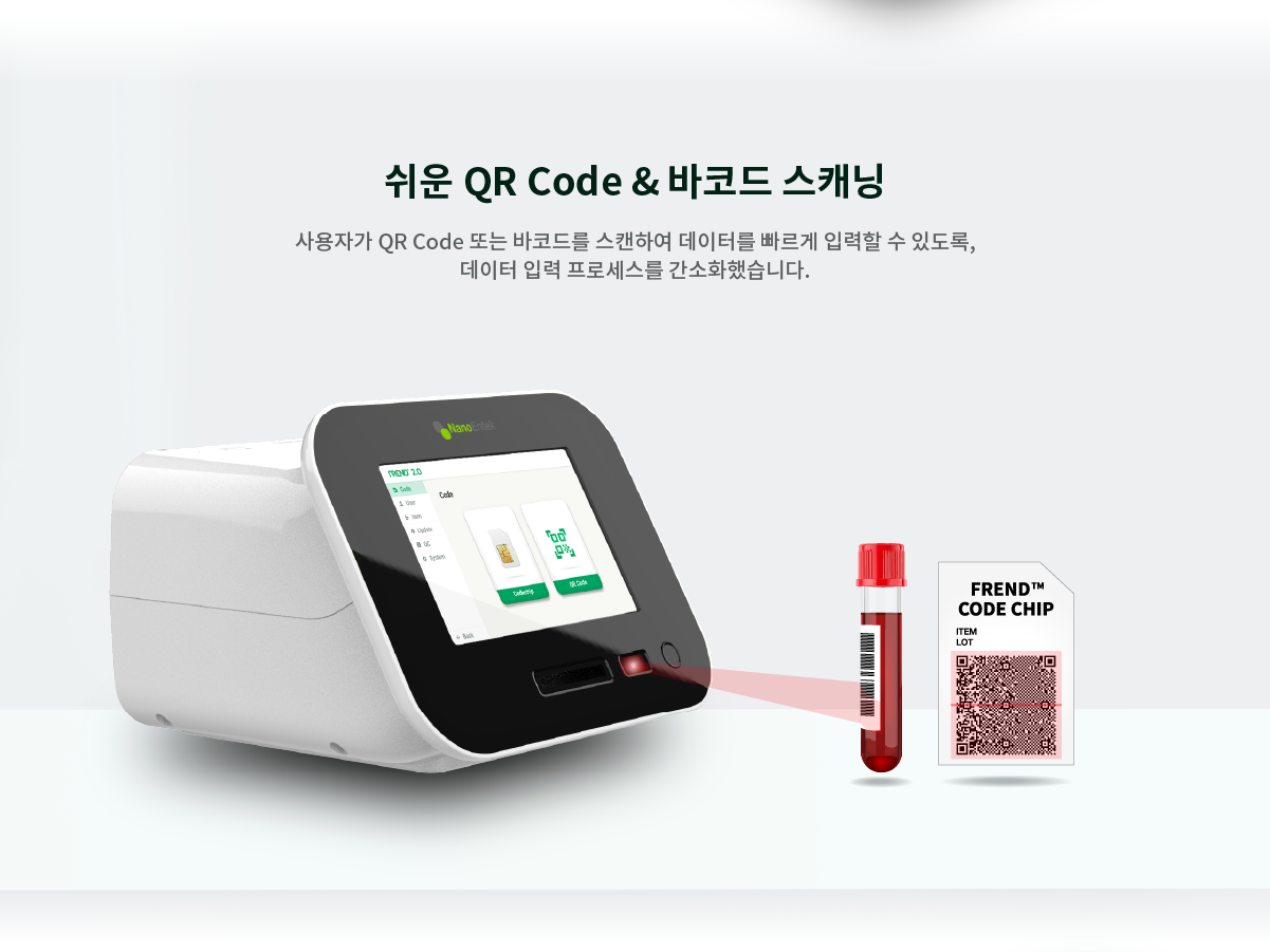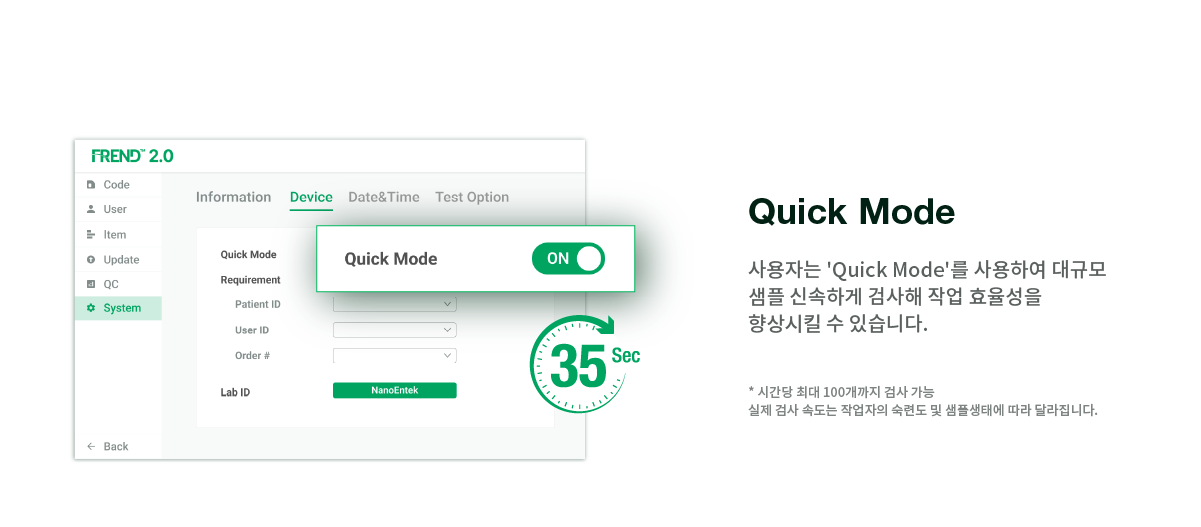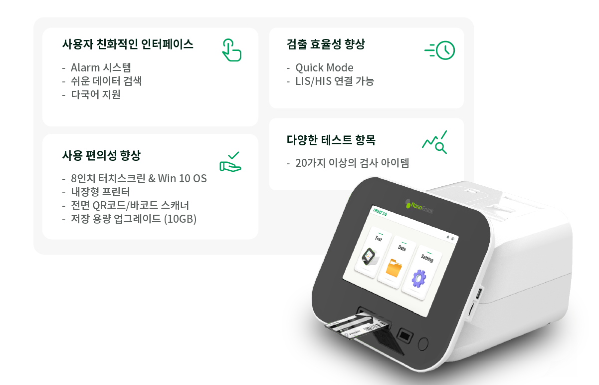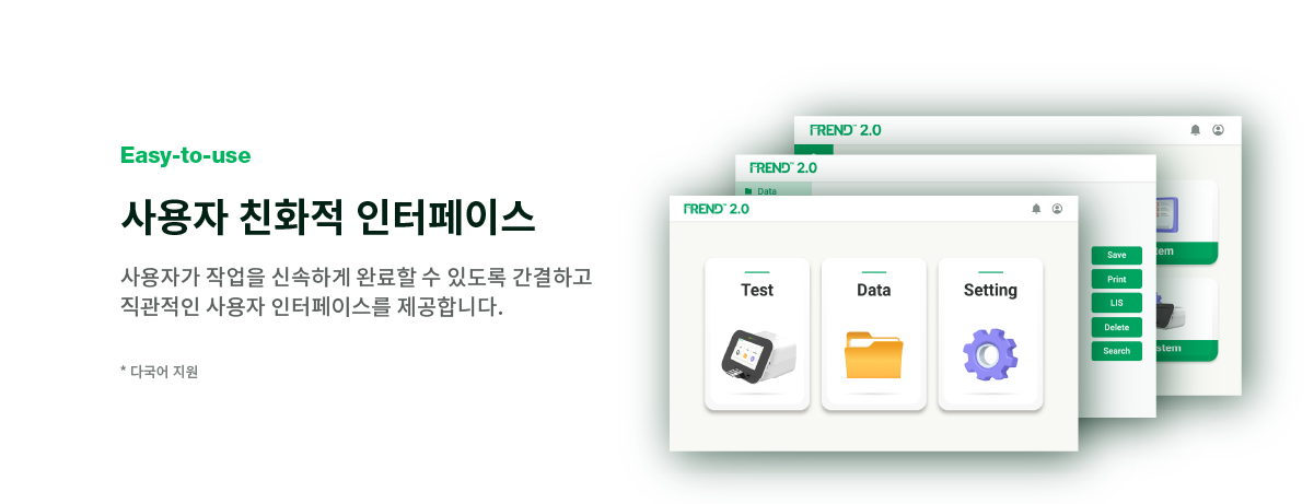 윈도우 10 운영 체제를 탑재한 8인치 터치스크린과 간결한 인터페이스를 갖추어 편의성을 보장하고, 결과 출력을 위해 편리한 프린터 및 전면부에 QR코드와 바코드가 인식 가능한 스캐너를 내장하고 있습니다. 그리고 사용자는 ‘Quick mode’를 통해 단시간 내에 많은 양의 샘플을 테스트하여 검사 시간을 절약할 수 있습니다. 알람 시스템은 유지 보수와 관련한 알림을 제공합니다. 또한 FREND 2.0은 다양한 국가의 유저를 위해 다국어 버전을 지원합니다.