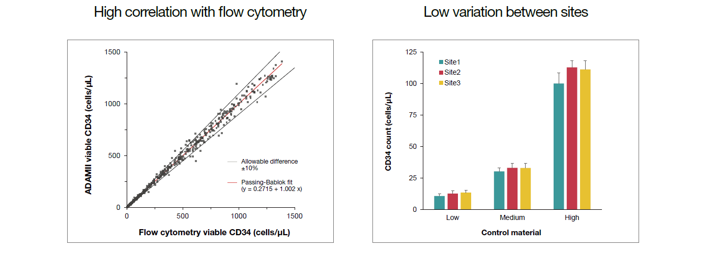 Substantially equivalent to flow cytometry ADAMII™ CD34 shows high correlation with flow cytometry along with low variation between sites, proving ADAMII™ CD34 provides high accuracy and consistency.
